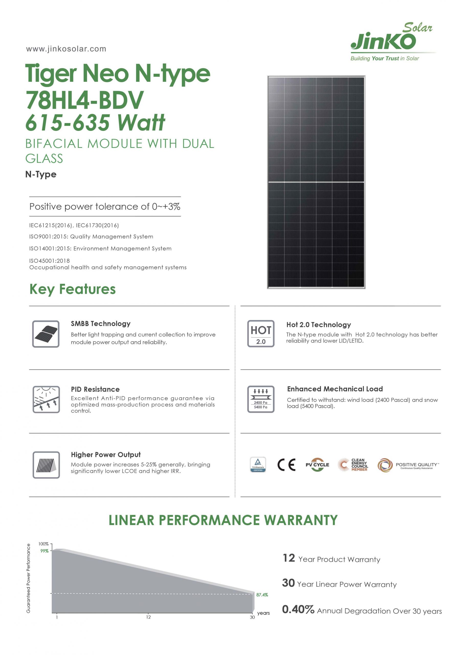Pin mặt trời JINKO Solar 615-635Wp 78HL4-BDV, dòng N-TYPE là dòng công suất cao nhất được sản xuất bởi Tập Đoàn JINKO Solar – nhà cung cấp tấm pin lớn nhất thế giới . Chất lượng sản phẩm được kiểm định nghiêm ngặt , cam kết đảm bảo hiệu suất >83% trong 30 năm.